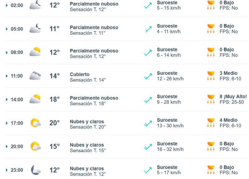 - A lo largo del día prevalecerá el viento moderado de suroeste, con rachas que podrán llegar hasta 29 km/h por la tarde.