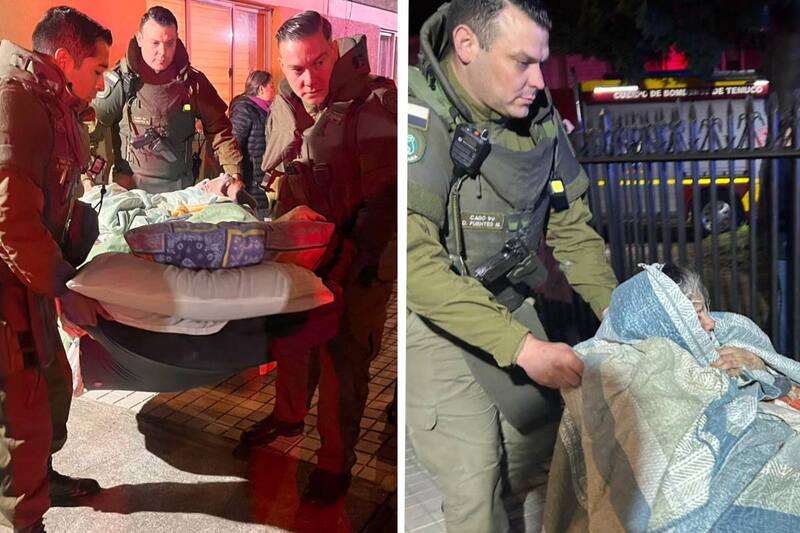 Al respecto, el teniente coronel Osvaldo Villarroel, comisario de la 2ª Comisaría de Temuco, detalló además que “los funcionarios ingresaron a la casa encontrando a una mujer de 84 años con movilidad reducida, a quien logran rescatar utilizando una silla de ruedas, y a un hombre de 94 años que estaba postrado en su cama, sacándolo al exterior con su propio colchón para disminuir el riesgo de una lesión”.