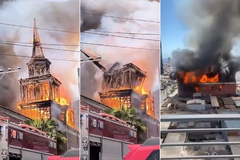 El incendio se propagó rápidamente por la patrimonial estructura y a los pocos minutos estaba envuelta en llamas. El fuego provocó el derrumbe de las dos torres de la iglesia, generando conmoción entre los iquiqueños.