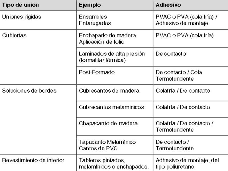 Existen diversos tipos de adhesivos para madera, según el tipo de aplicación deseada y el tipo de tablero que se emplee para tal efecto. Se pueden clasificar en tres tipos principalmente: