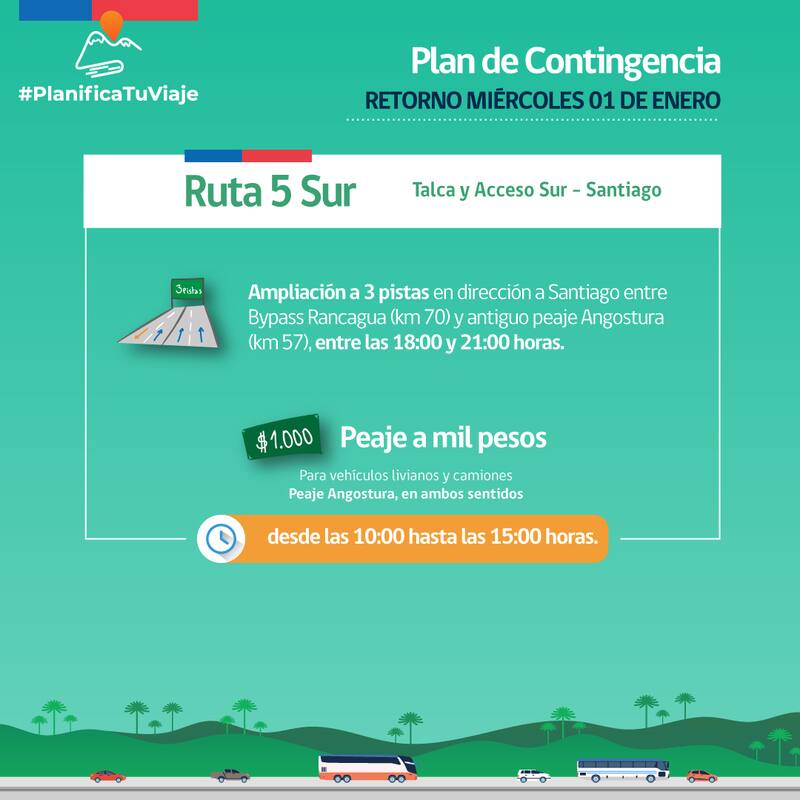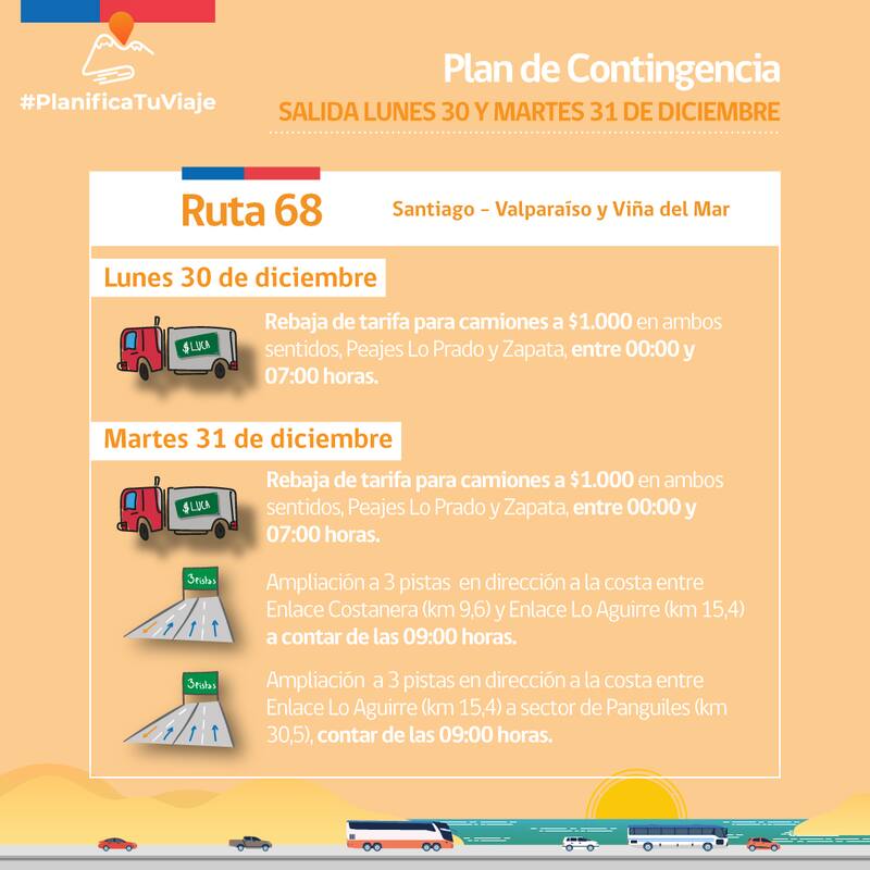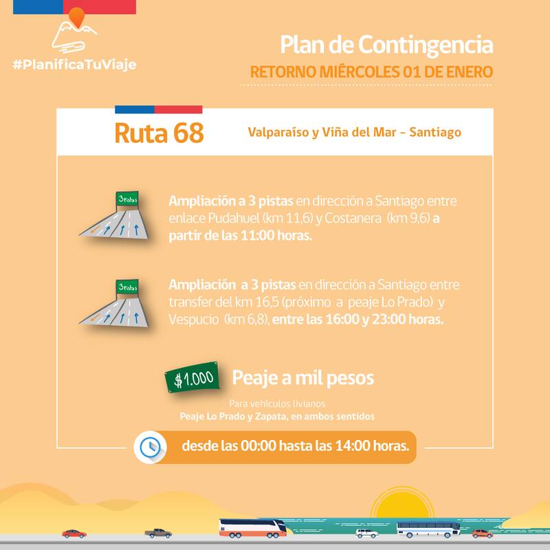 Como ha ocurrido en otras ocasiones , la autoridad del MOP destacó que se aplicarán medidas especiales para la salida y el retorno principalmente en la Ruta 68 Santiago- Valparaíso, como el peaje rebajado a $1.000, el sistema de pistas 3x1, además del mecanismo free flow, que facilita el desplazamiento de los automovilistas al cobrar mediante pórticos y no con barreras y casetas.
