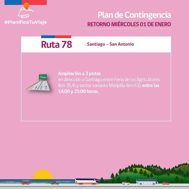 Por su parte, el ministro (s) de Obras Públicas, Cristóbal Leturia, advirtió que "todas las personas que deseen salir de Santiago para el Año Nuevo deben esperar una alta congestión en todas las carreteras. Independiente del horario en que salgan, sea hoy lunes o mañana martes, las personas deben tener expectativas de encontrar alto tráfico, en especial este martes hasta las 7 de la tarde en rutas como la 68. Esto es lo normal en estas fechas, lo importante es tomarlo con conciencia, con planificación y precaución para no tengamos accidentes que lamentar y todos puedan celebrar estas fiestas en tranquilidad y en familia".
