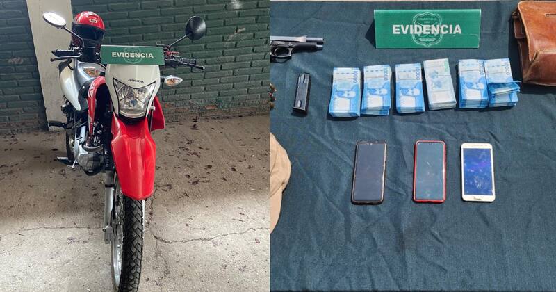 En el lugar fue recuperado el dinero sustraído de la víctima, como también una pistola calibre 9 mm., un cargador, municiones y la misma motocicleta.