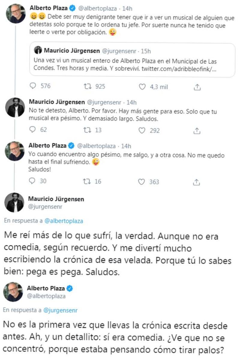 Pese a no mencionar la cuenta oficial del cantante, Plaza respondió a los pocos minutos... con más bencina. "Debe ser muy denigrante tener que ir a ver un musical de alguien que detestas solo porque te lo ordena tu jefe. Por suerte nunca he tenido que leerte o verte por obligación", replicó el artista.