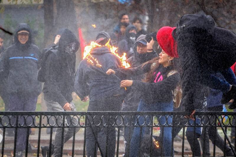 [Foto] Encapuchado se quemó con su bomba molotov durante la marcha docente