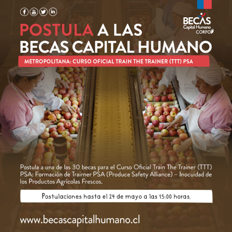 Conscientes de esta situación, Corfo Metropolitano a través del Programa Becas Capital Humano realizará por primera vez en el país el curso "Oficial Train The Trainer PSA, Inocuidad de los productos agrícolas Frescos" y que será financiado en un 80% por La Corporación de Fomento de la Producción.