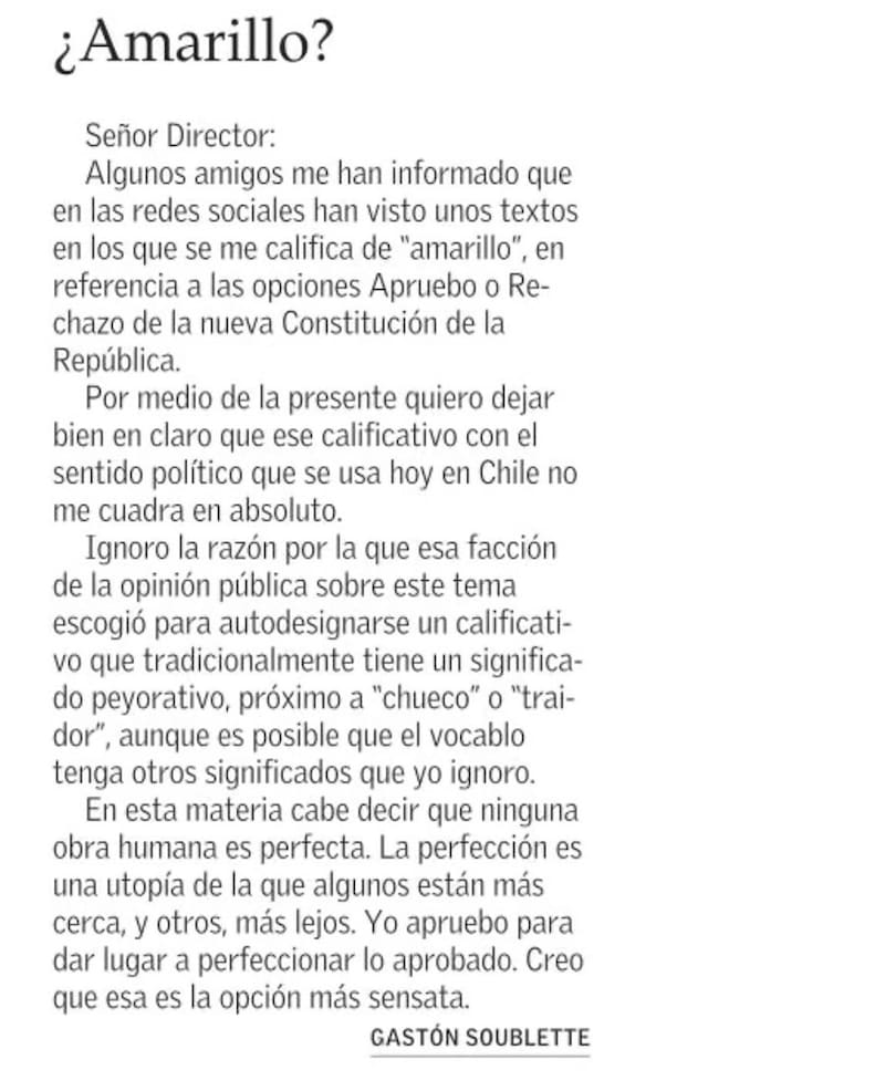 “Por medio de la presente quiero dejar bien en claro que ese calificativo con el sentido político que se usa hoy en Chile no me cuadra en absoluto”, parte diciendo la misiva titulada simplemente”¿Amarillo?”.
