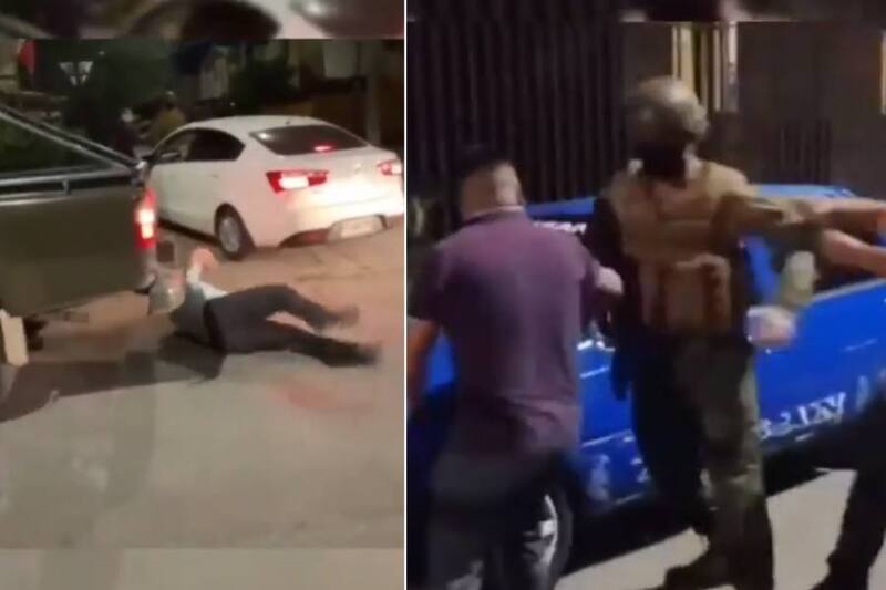 Tal como se puede ver en las imágenes, dos sujetos increpan y golpean a un funcionario de las Fuerzas Armadas. Incluso, uno de ellos simula ser atropellado por una camioneta que pertenecería al grupo fiscalizador.