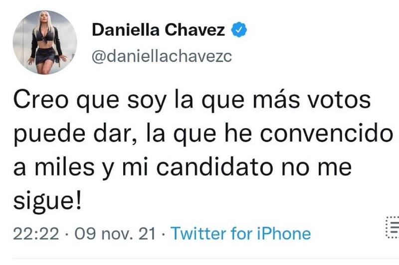Con este mensaje en redes sociales (escrito a las 22:22 horas), Daniella Chávez dio que hablar entre sus seguidores, quienes aún especulan sobre qué candidato o candidata recibirá su voto en las próximas elecciones presidenciales.