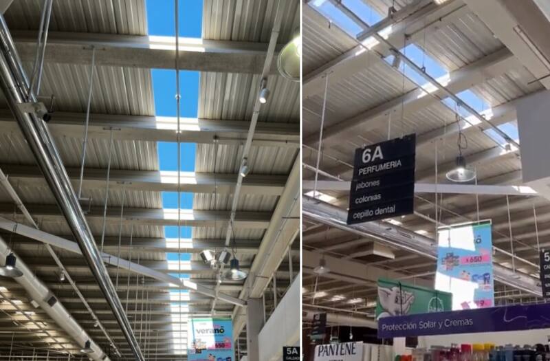 Desde el interior de un supermercado, las personas dieron cuenta del momento en que parte del techo se vuela producto del fuerte viento.