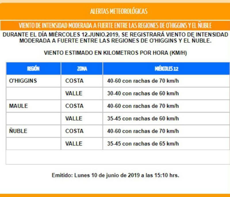 En la costa de O'Higgins se estiman vientos de entre 40 y 60 kilómetros, con rachas de hasta 70 km/h. En el valle, irán entre los 30 y 40 kilómetros, con rachas de 60 km/h.