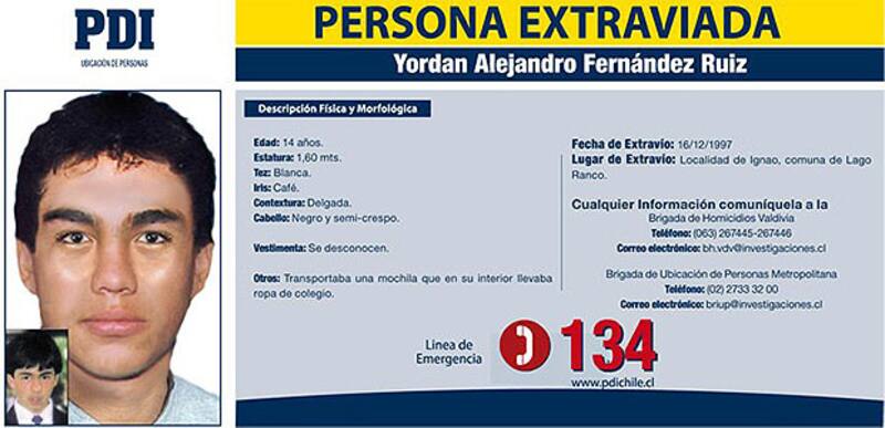 La última vez fue visto en su liceo, Ricardo Fenner de de La Unión, en diciembre de 1997. Sus familiares han recurrido a la ayuda de videntes, pero la desaparición sigue siendo un doloroso misterio.