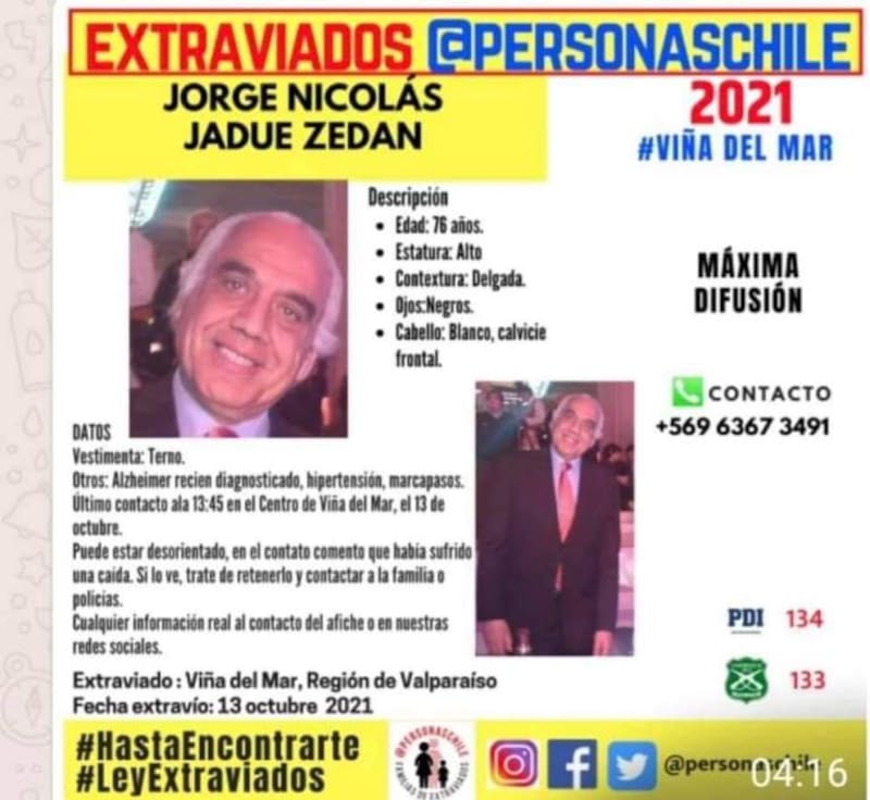 No se sabe nada de él desde el pasado miércoles 13 de octubre, cuando se perdió su rastro mientras estaba en el centro de Viña del Mar.