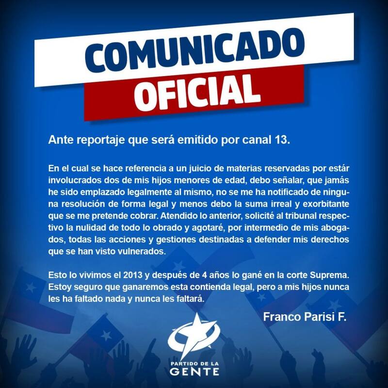 El postulante a La Moneda quien se encuentra viviendo en Estados Unidos desde el año pasado compartió un comunicado luego de que Canal 13 transmitiera un reportaje que detalló la millonaria deuda de alrededor de $200 millones que posee tras no hacerse cargo de sus dos hijos.