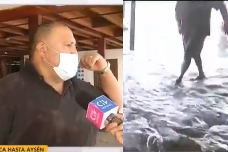 Cerca de la playa, el comunicador estaba entrevistando a Nelson Tapia, dueño de un quiosco, quien se encontraba ordenando su puesto, revisando si habían daños.