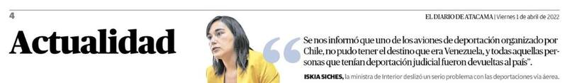 El pasado 1 de abril, en diálogo con el diario de Atacama, la autoridad reveló que “se nos informó que uno de los aviones de deportación organizado por Chile, no pudo tener el destino que era Venezuela, y todas aquellas personas que tenían deportación judicial fueron devueltas al país”.