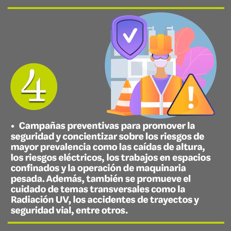 Es que tío… Estamos convencidos de que la mejor manera de protegerte es evitando los accidentes laborales, ya sean a causa o con ocasión del trabajo o aquellos que suceden en el trayecto entre tu lugar de trabajo y tu hogar ¿Vale? Por eso, Mutual de Seguridad como administrador del seguro de accidentes laborales, tiene un fuerte rol preventivo y promueve con las empresas adherentes y sus trabajadores protegidos las siguientes acciones: