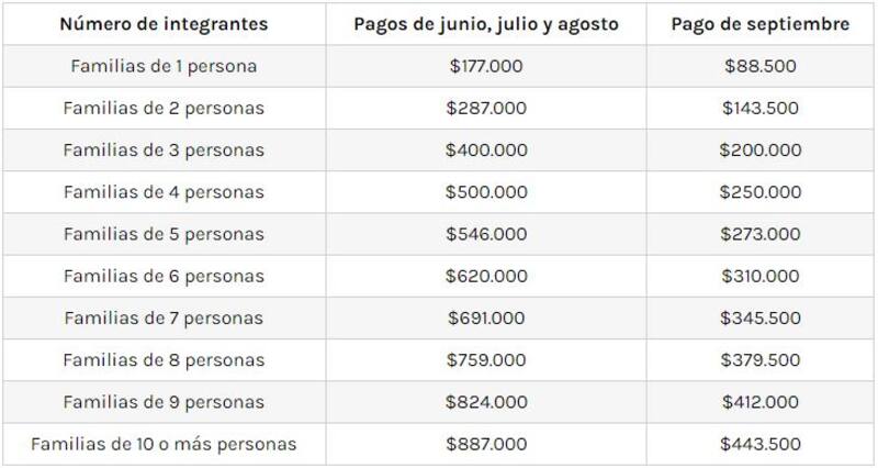 De esta manera, por ejemplo, para las familias de una persona, que en junio, julio y agosto recibieron $177.000, en septiembre se les depositará $88.500.