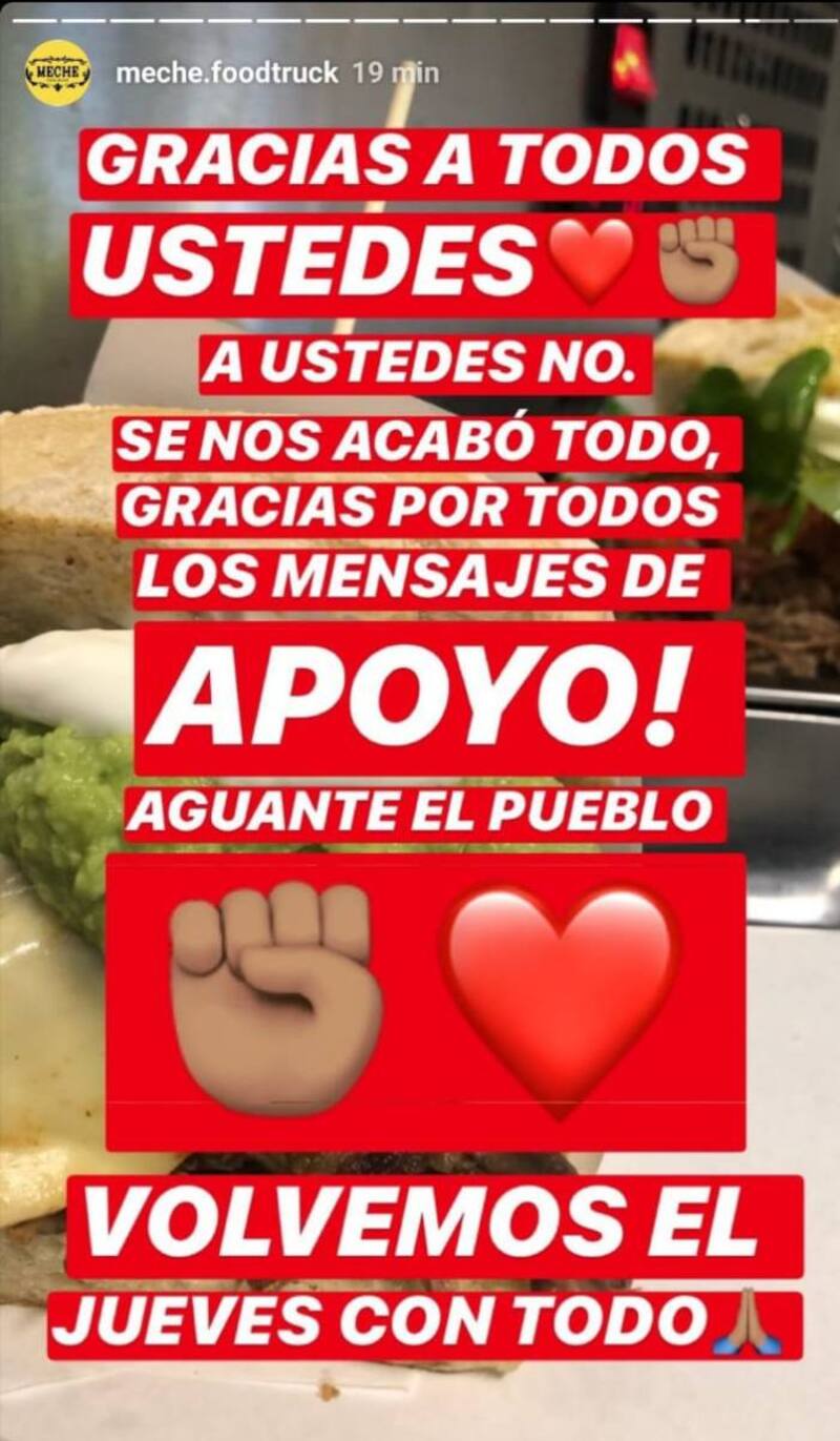 Horas más tarde, tras la viralización de la "funa", el foodtruck informó de la situación en sus redes sociales. "Gracias a todos ustedes. A ustedes no. Se nos acabó todo, gracias por todos los mensajes de apoyo! Aguante el pueblo", escribieron en Instagram.