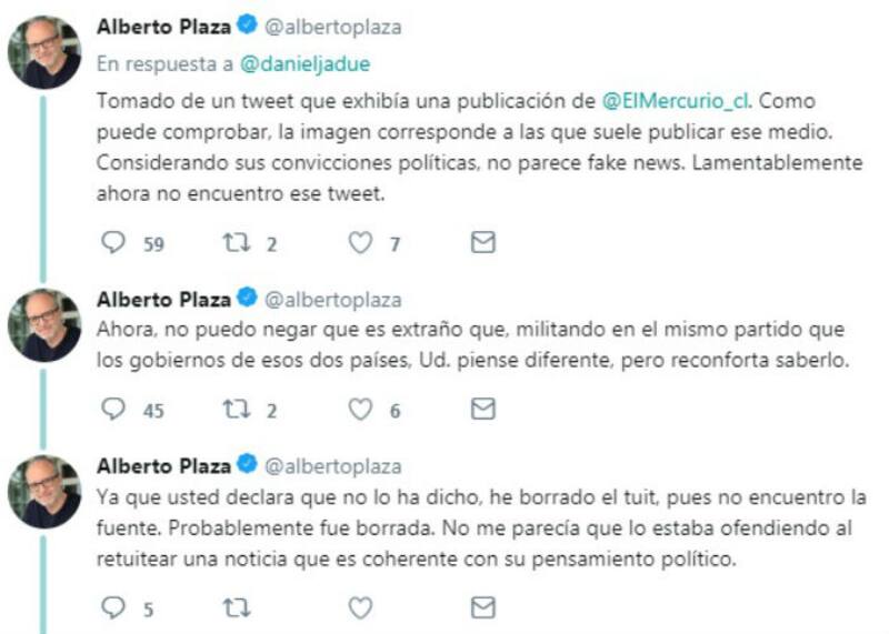 "Tomado de un tweet que exhibía una publicación de @ElMercurio_cl. Como puede comprobar, la imagen corresponde a las que suele publicar ese medio. Considerando sus convicciones políticas, no parece fake news. Lamentablemente ahora no encuentro ese tweet", argumentó Plaza.