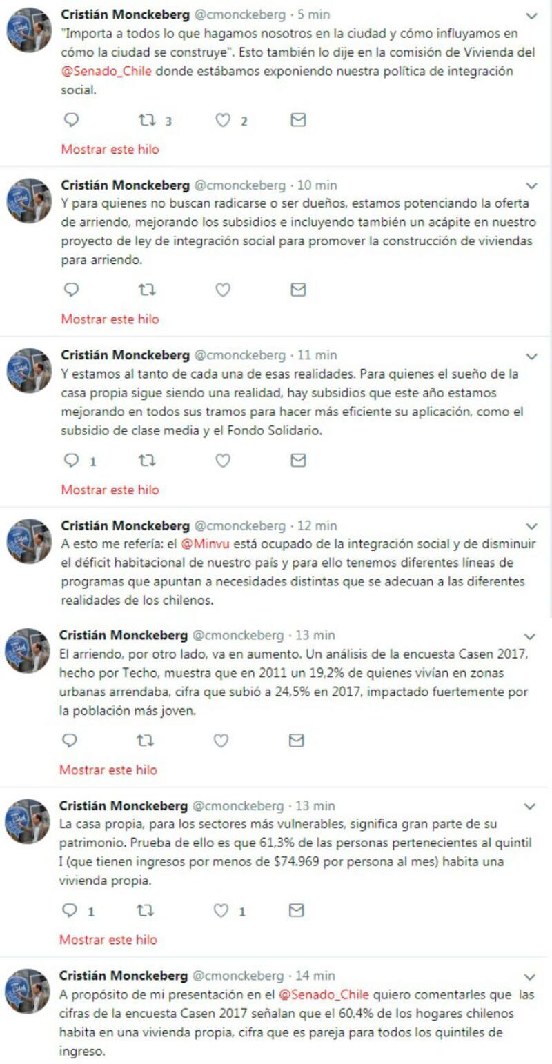 De esta manera, el ministro de Vivienda, Cristián Monckeberg , comenzó una extensa aclaración pública a través de Twitter. El secretario de Estado salió al paso de la polémica que generaron sus palabras acerca de la posesión de propiedades de los chilenos. "La mayoría de los chilenos somos propietarios. La casita, dos departamentos", señaló, el pasado 14 de agosto.