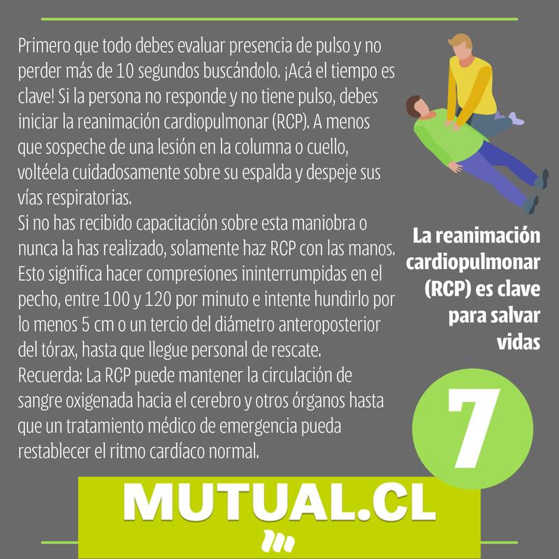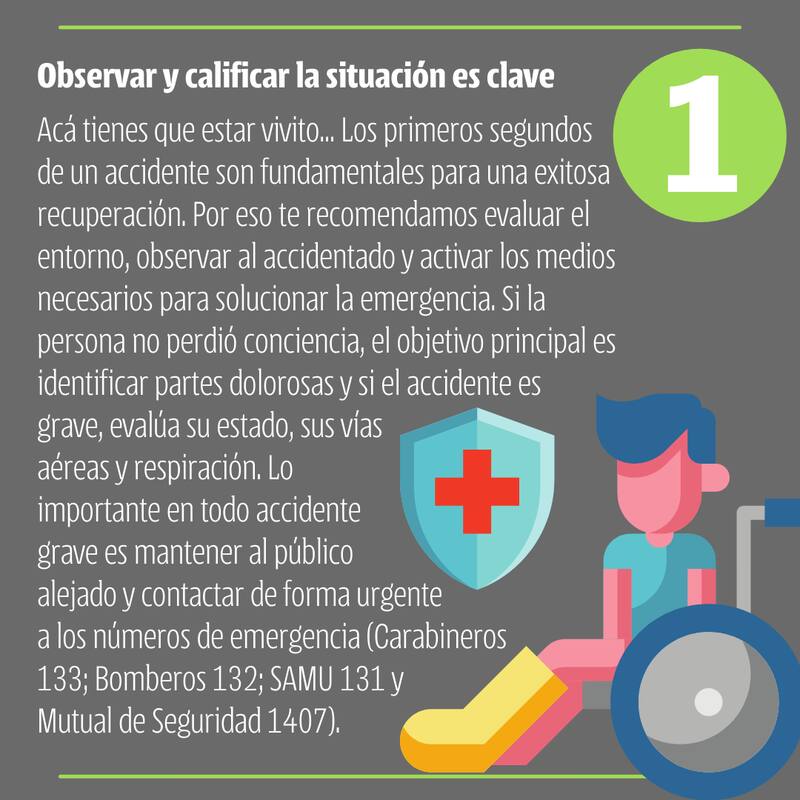 Cualquiera de nosotros puede ser víctima o testigo de un accidente, ya sea en la casa, en nuestros trayectos o incluso en el trabajo. Proceder adecuadamente frente a heridas, traumatismos, quemaduras o paro cardiorrespiratorio, puede resultar vital para una persona. Por eso, Mutual de Seguridad junto a La Cuarta te entregan las 7 claves para saber cómo actuar ante accidentes y estar preparados con los conocimientos básicos de primeros auxilios.