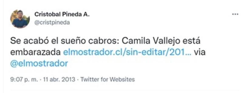 Se volvió a referir a Vallejo en 2013, cuando ella anunció su embarazo. “Se acabó el sueño, cabros, Camila Vallejo está embarazada”, escribió.