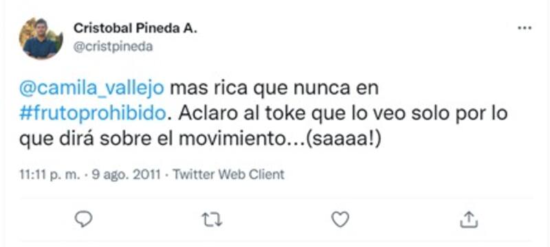 Fue en esos días álgidos, cuando Vallejo se hacía familiar para la ciudadanía, que Pineda publicó algunos comentarios hoy considerados machistas. Según La Tercera, en agosto de 2011, es decir mucho antes de las movilizaciones feministas de 2018, el entonces estudiante de ingeniería se refirió a la participación de la futura ministra vocera en un programa de TVN. “@camila_vallejo más rica que nunca en #FrutoProhibido”, tuiteó.