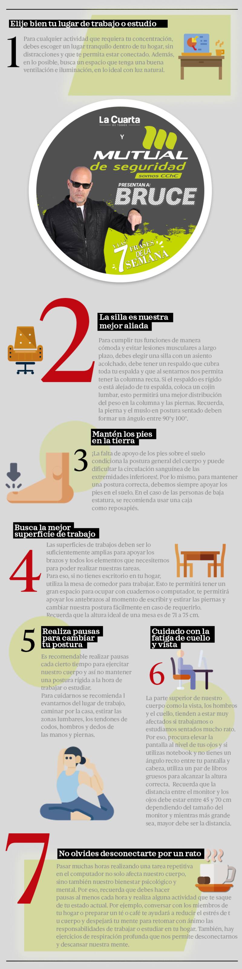 Esto nos ha llevado a pasar muchas horas en posiciones estáticas, descuidando la postura. Por eso, Mutual de Seguridad, junto a la Cuarta, te comparten algunos consejos de ergonomía para proteger tu postura y no generar lesiones musculares.