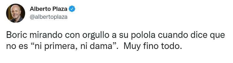 “Boric mirando con orgullo a su polola cuando dice que no es ‘ni primera, ni dama’. Muy fino todo”, ironizó.