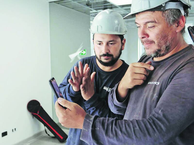 Ocho trabajadores con discapacidad auditiva se desempeñan en la obra de Nuevo Edificio Consistorial, de Huechuraba. Lo hacen con la ayuda de videollamadas y la empatía de sus colegas.