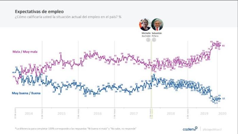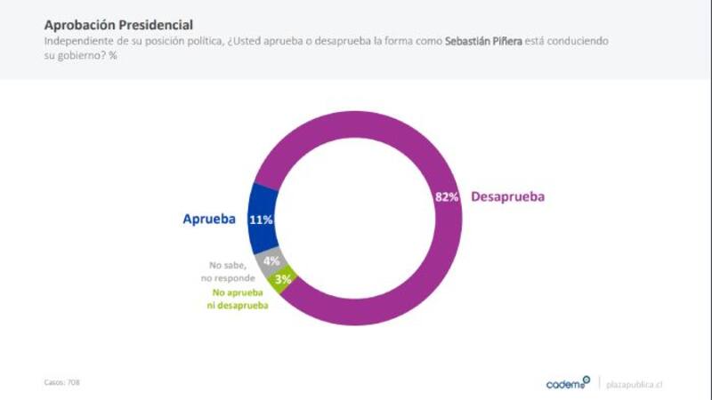 Este domingo se comunicó la última encuesta Plaza Pública de Cadem, correspondiente a la semana pasada (desde el miércoles 29 al viernes 31 de enero de 2020), en la cual evidencia la difícil situación del presidente Sebastián Piñera, que no logra repuntar, con una aprobación del 11% y una desaprobación del 82%, es decir, dos puntos menos y dos puntos más, respectivamente, a la anterior muestra (12% a favor y 80% en contra).