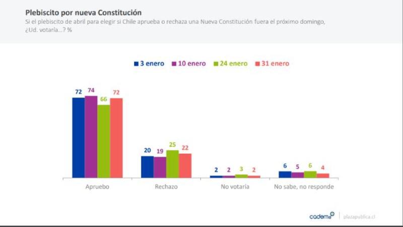Otro de los aspectos que destaca en la muestra es lo referente a la Nueva Constitución, en la cual un 66% dijo estar de acuerdo con una nueva carta fundamental, mientras que un 25% se mostró abiertamente en desacuerdo con un posible proceso constituyente.