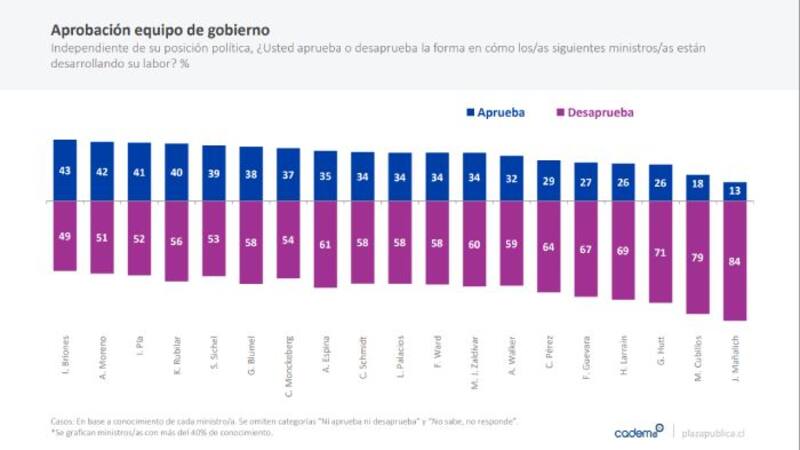 Con respecto al desempeño de sus ministros, la historia es similar: el gabinete presentó una aprobación de un 14% y desaprobación de 81%. En ese escenario Gonzalo Blumel sigue siendo percibido como el ministro más influyente dentro del Gobierno, en tanto que Ignacio Briones, titular de Hacienda, es quien ostenta el mayor grado de aprobación (43%), seguido de Alfredo Moreno (42%) en Obras Públicas e Isabel Plá (41%) en la cartera de Mujer y la Equidad de Género.