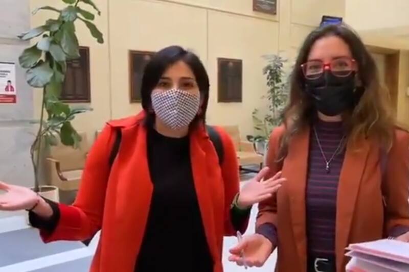 Ambas parlamentarias se ubicaron en el lobby del Congreso para hacer su breve sketch. Cariola se acercó a su colega: