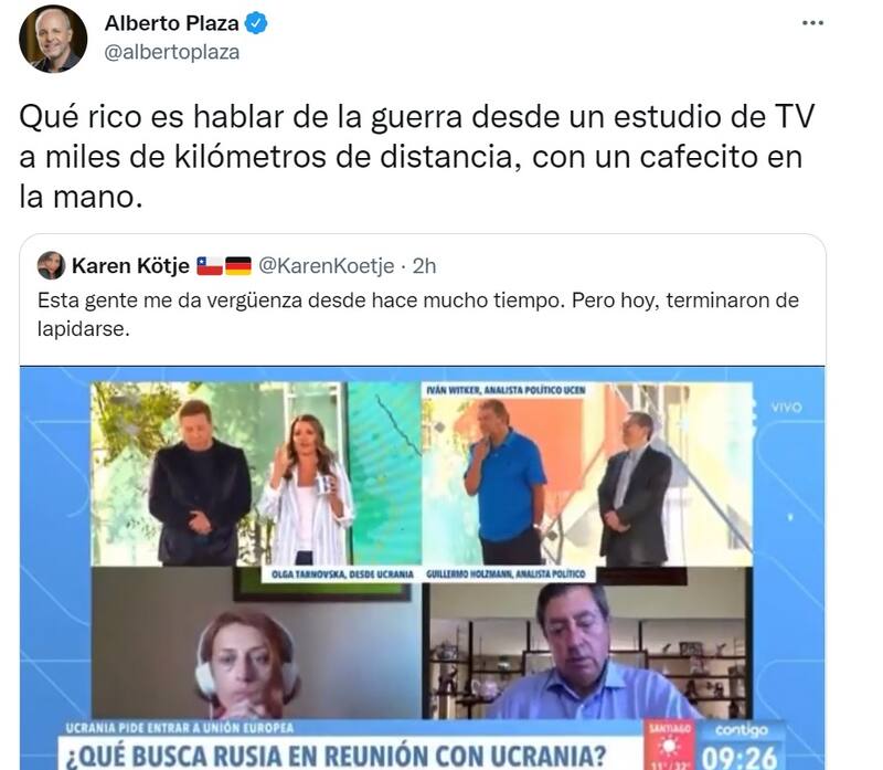 Al tanto de este momento televisivo, el cantante Alberto Plaza recurrió a su cuenta de Twitter para cuestionar a la conductora. “Qué rico es hablar de la guerra desde un estudio de TV a miles de kilómetros de distancia, con un cafecito en la mano”, lanzó. A los pocos minutos, el artista borró su publicación.