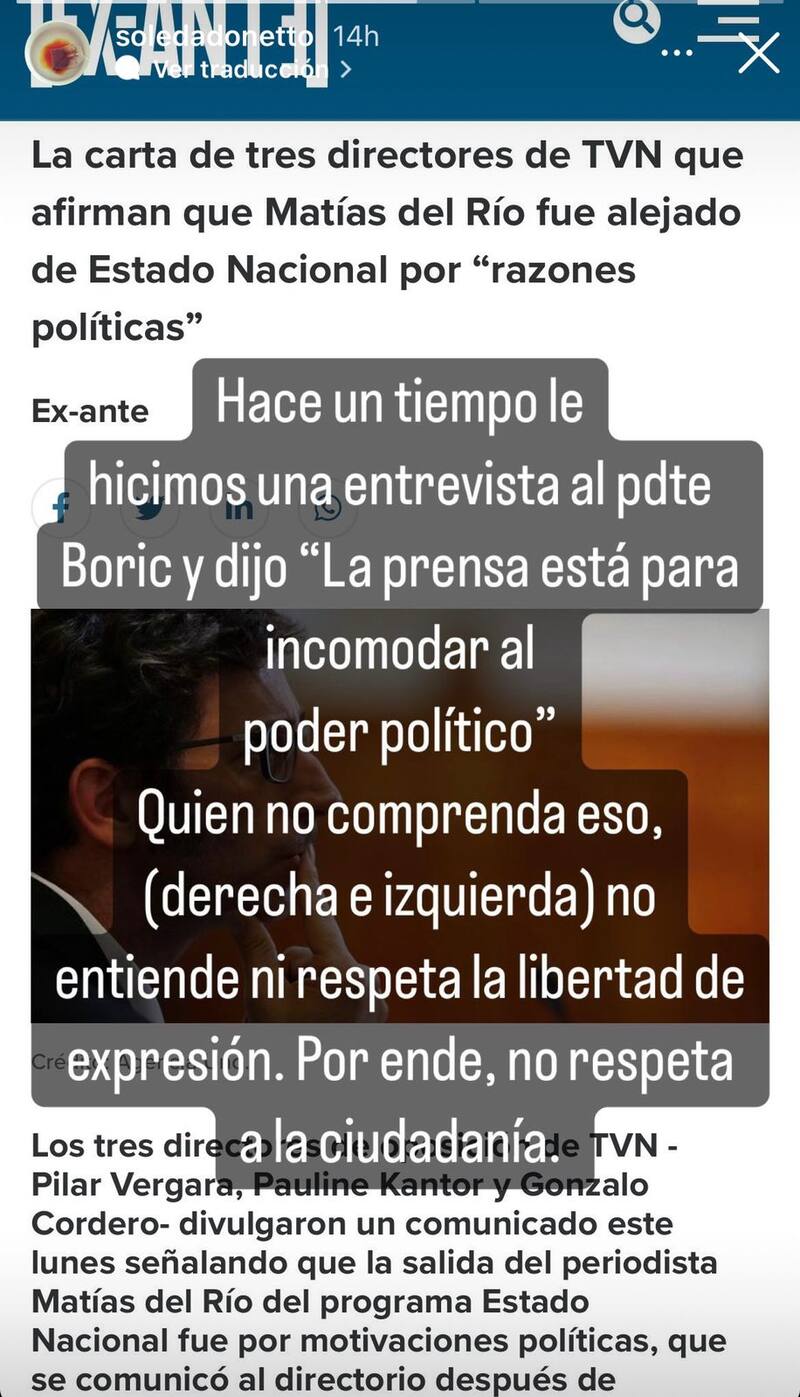 “Hace un tiempo le hicimos una entrevista al presidente Boric y dijo: ‘La prensa está para incomodar al poder político’. Quien no comprenda eso (derecha e izquierda), no entiende ni respeta la libertad de expresión, por ende no respeta a la ciudadanía”, escribió junto a un pantallazo de una noticia que abordaba la situación del periodista.