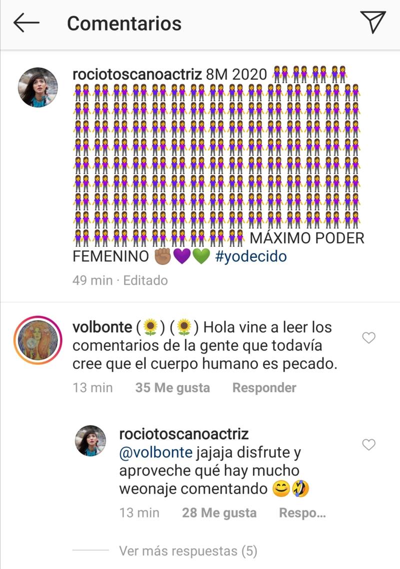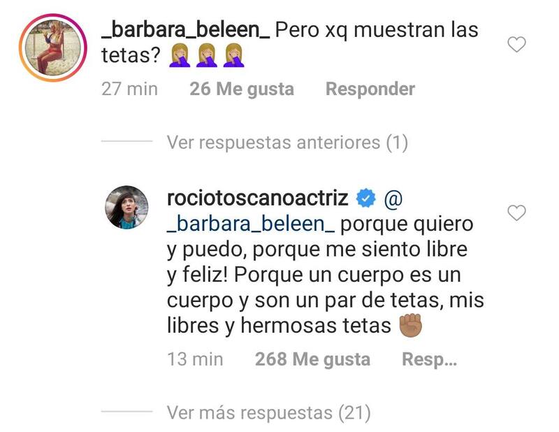 Rápidamente la imagen se llenó de "me gusta" y comentarios que apoyaban a la actriz, mientras que otra mujer le consultó el porqué de su decisión, a lo que Rocío contestó "porque quiero y puedo, porque me siento libre y feliz! Porque un cuerpo es un cuerpo y son un par de tetas, mis libres y hermosas tetas" (sic).