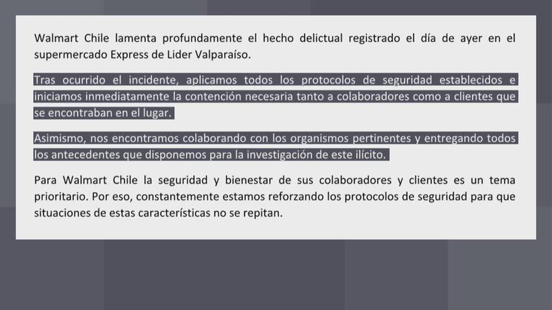 “Lamentamos profundamente el hecho delictual registrado el día de ayer en el supermercado Express de Líder Valparaíso (…) tras ocurrido el incidente, aplicamos todos los protocolos de seguridad establecidos e iniciamos inmediatamente la contención necesaria tanto a colaboradores como a clientes que se encontraban en el lugar”, afirmaron buscando dejar atrás el terrorífico momento.
