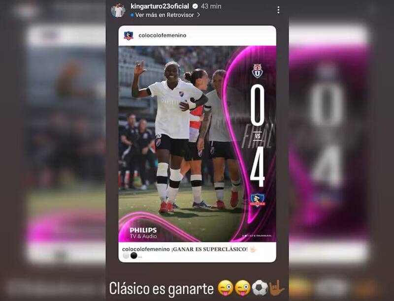 A pesar de que este fin de semana el conjunto de Jorge Almirón no vio la acción, en Colo Colo se jugó el Superclásico femenino ante Universidad de Chile. Arturo Vidal fue uno de los hinchas del Cacique que alentó a las albas, y a través de las redes sociales compartió un provocador mensaje.
