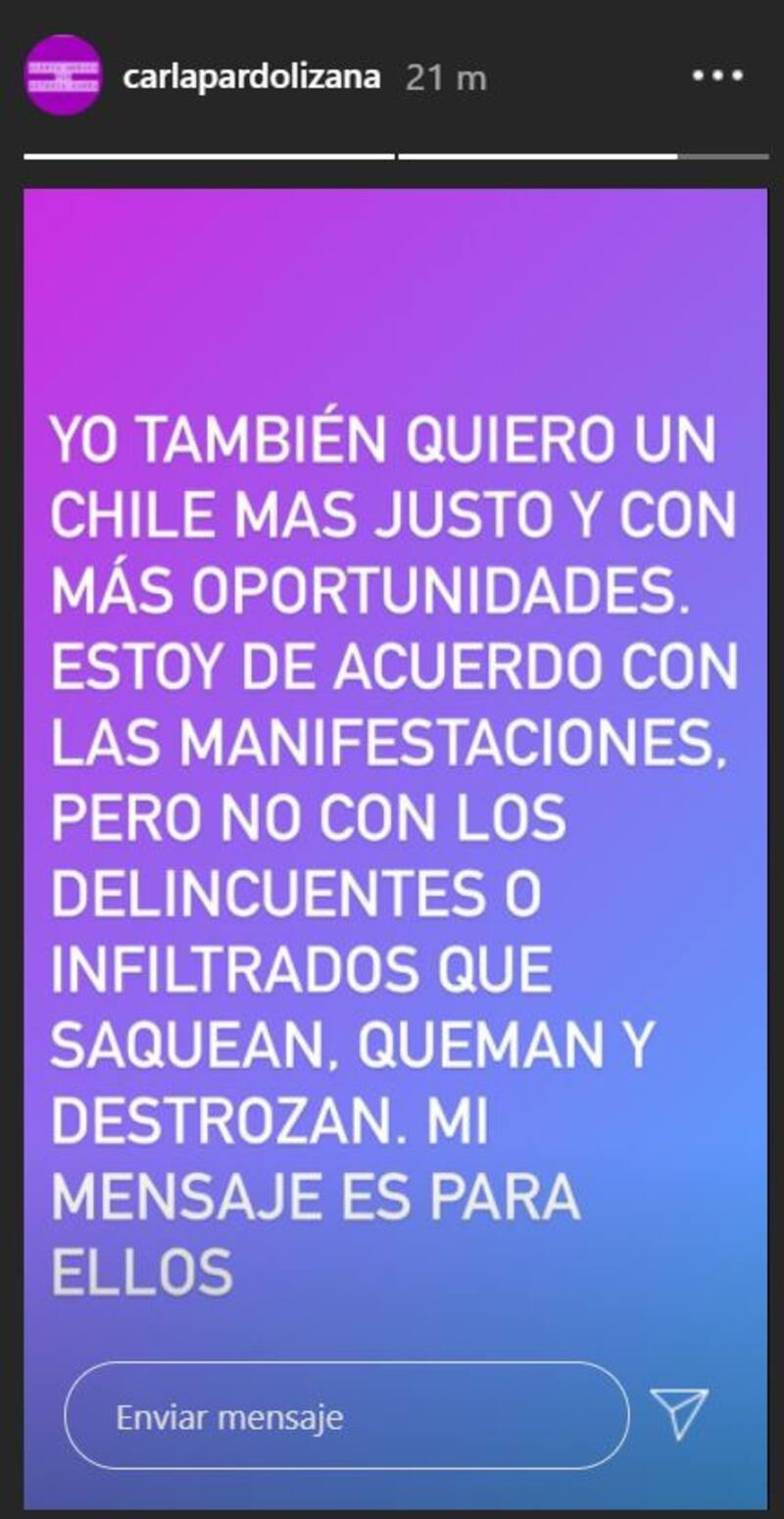 Tras ello, explicó sus dichos apuntando a los vándalos que empañan la lucha social. "Yo también quiero un Chile más justo y con más oportunidades. Estoy de acuerdo con las manifestaciones, pero con los delincuentes o infiltrados que saque, queman y destrozan. Mi mensaje es para ellos", cerró.