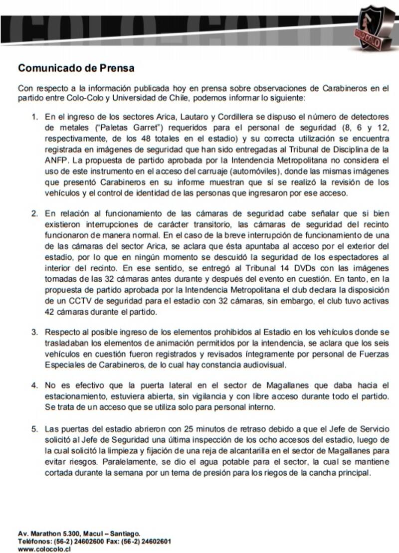 En el texto se recalca la entrega de las imágenes que grabaron las 42 cámaras de seguridad que tuvo activas el pasado 25 de agosto. Asimismo desestimaron la utilización de una puerta lateral por Magallanes y recalcaron que el atraso en la apertura de puertas se debió la implementación de Jefe de Servicio de turno.