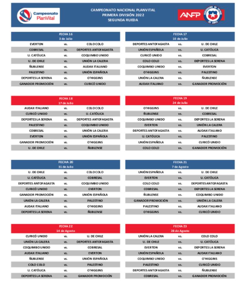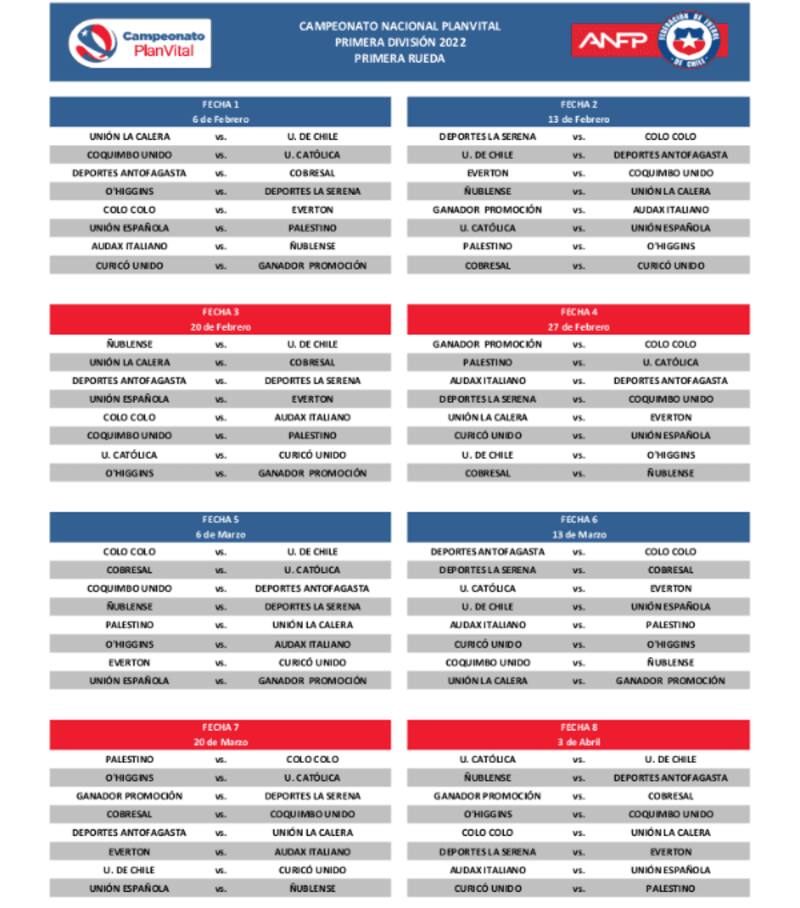 Apenas algunos minutos después de que Colo-Colo se abrazara en Concepción tras derrotar en la final de la Supercopa a Universidad Católica por 2 tantos a 0, la ANFP publicó el fixture del Campeonato PlanVital 2022, que iniciará en dos semanas, más específicamente el viernes 4 de febrero, con la particularidad de que, al contrario de otras ocasiones, no habrá que esperar demasiado para los clásicos…