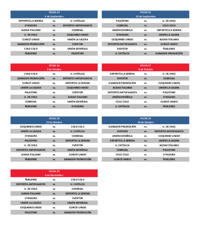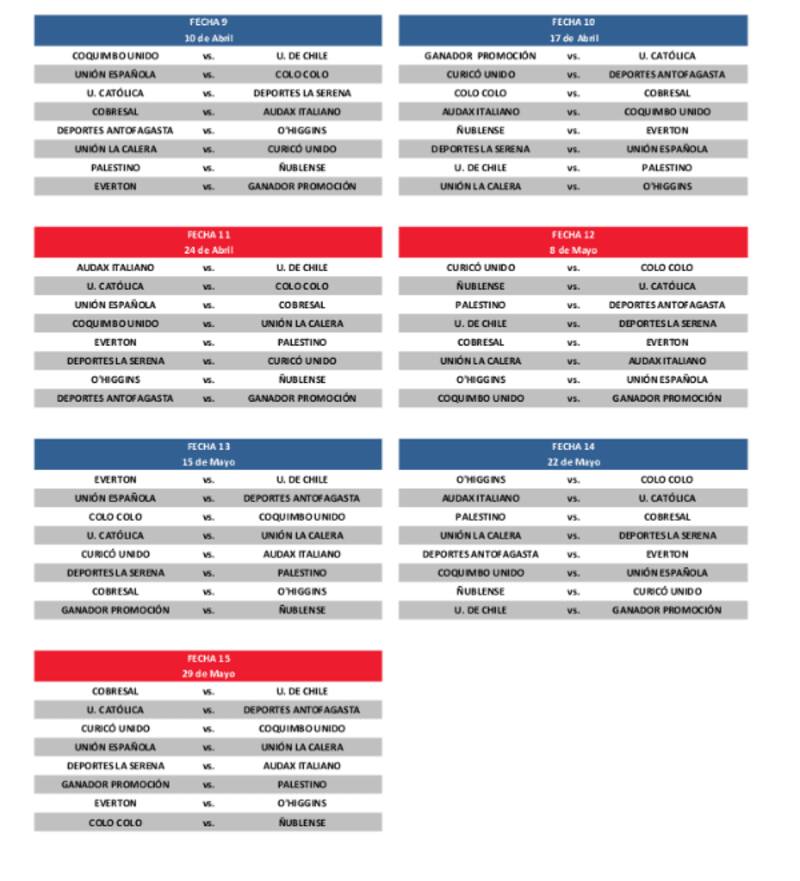 En concreto, el Superclásico del fútbol nacional, el duelo entre Colo-Colo y Universidad de Chile se disputará en la quinta fecha, el domingo 6 de marzo, cuando el certamen recién cumpla un mes. Como pasó en el torneo anterior, los dos más grandes del balompié local medirán fuerzas primero en el Estadio Monumental y en la segunda fase en el Nacional.