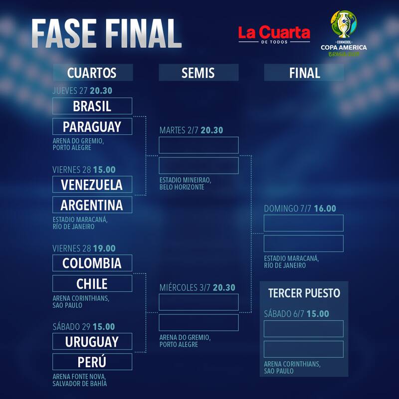 Una vez consumada la derrota de la "Roja" ante Uruguay, se terminó por definir a los ocho equipos clasificados a los cuartos de final de Copa América. El combinado nacional enfrentará a Colombia en Sao Paulo.