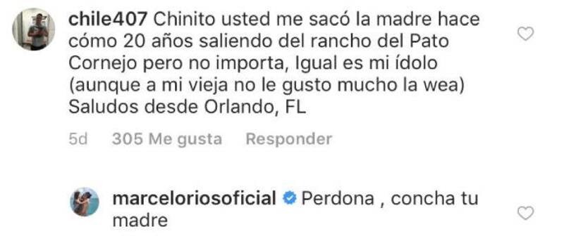 Al final, hubo otro posteo que llamó la atención de varios. "Chinito, usted me sacó la madre hace cómo 20 años saliendo del rancho del Pato Cornejo, pero no importa, igual es mi ídolo (aunque a mi vieja no le gusto mucho la hue****) Saludos desde Orlando, Florida", le escribió el usuario.