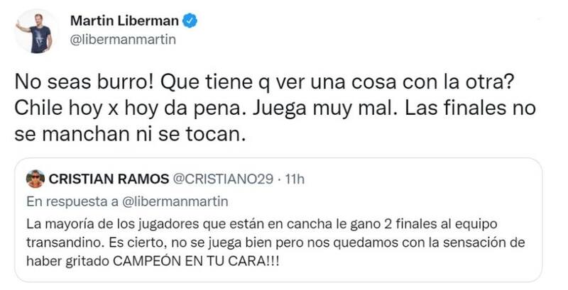 "No seas burro! Que tiene q ver una cosa con la otra? Chile hoy x hoy da pena. Juega muy mal. Las finales no se manchan ni se tocan", le contestó Liberman.