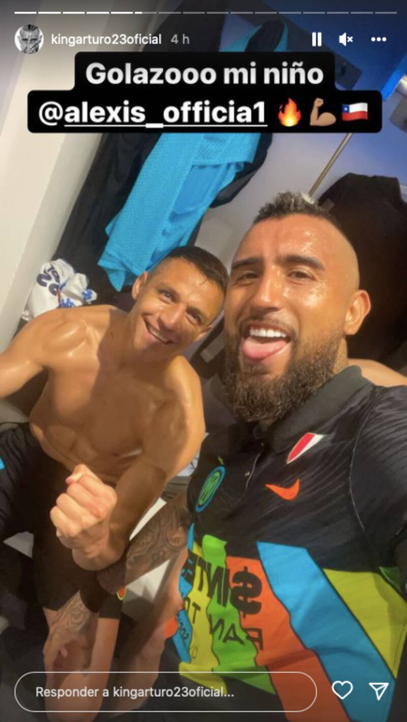 “Golazo, mi niño”, le escribió Vidal a Sánchez en una historia de la red social, en la que se puede ver a ambos en los camarines del Estadio San Siro, el primero sacando la lengua y el segundo sentado a torso descubierto, ambos con una sonrisa en sus rostros.