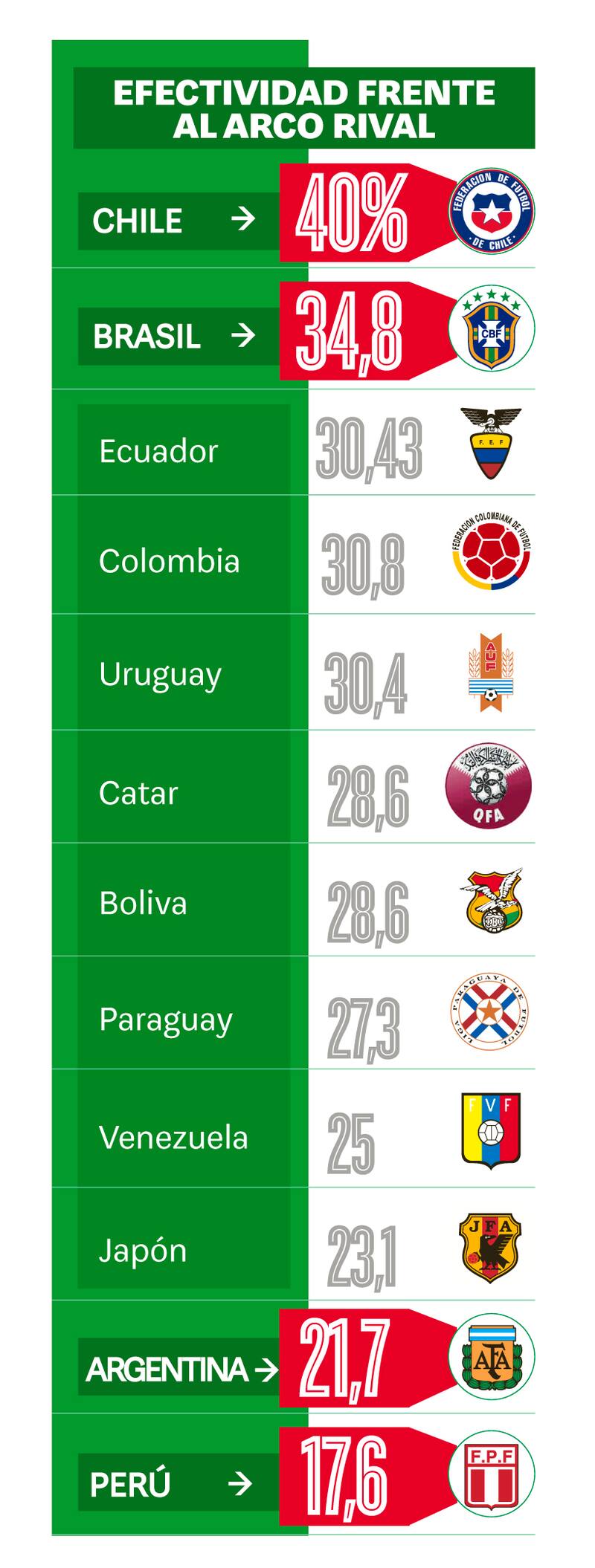 Un rendimiento que se ha plasmado en la efectividad en el arco rival. Aunque usted no lo crea, Chile suma un 40% de eficacia. Superando a selecciones como Brasil, Uruguay y Argentina según consignó el dato del estadístico Pelotazo.