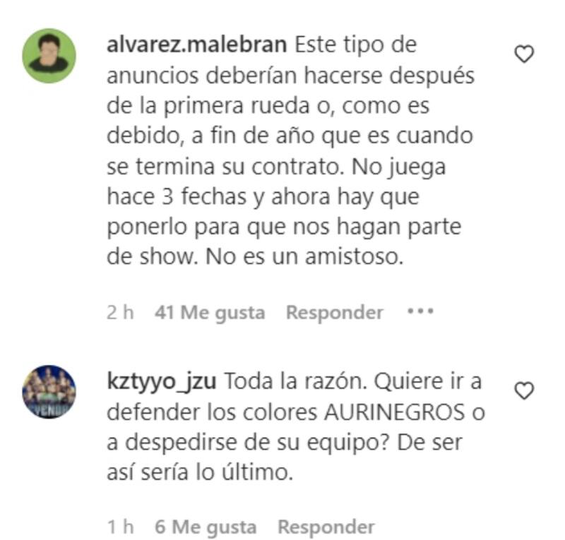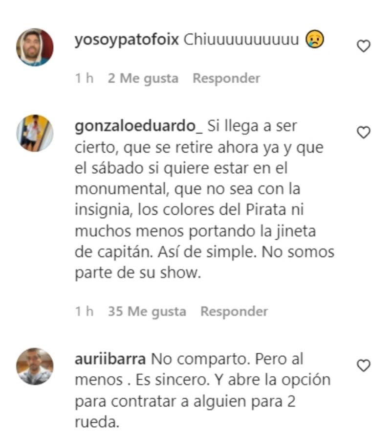 “No juega hace tres fechas y ahora hay que ponerlo para que nos hagan parte de su show…, no es un amistoso”, se quejó por ejemplo el usuario @alvarez.malebran. “Ni Pinigol nos hizo esta hu…”, lamentó otro hincha pirata. “Si llega a ser cierto, que se retire ahora ya”, pidió finalmente otro.